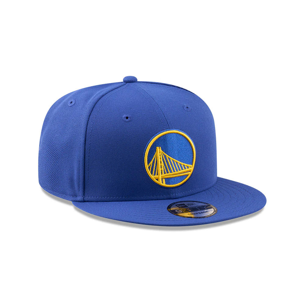 The Golden State Warriors NBA Essentials OTC 9FIFTY Snapback features an embroidered raised Warriors logo at the front panels in official team colours with a NE Flag logo on the left.